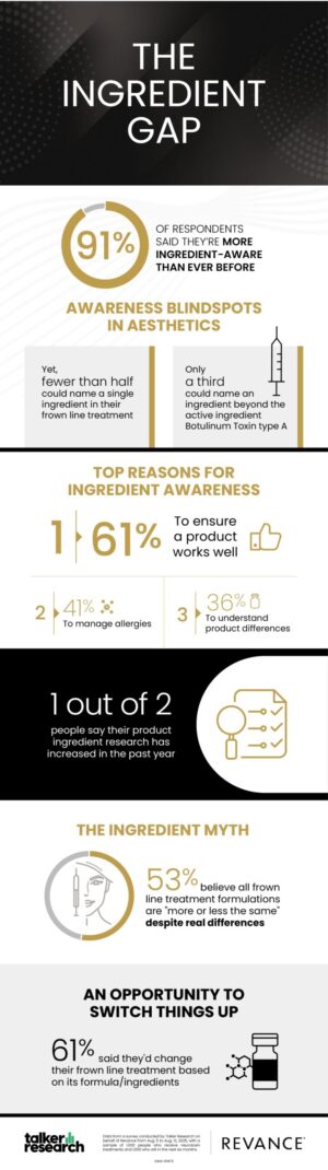 NASHVILLE, TN. — September 23, 2025 — From skincare to supplements, Americans are paying closer attention than ever to the ingredients in the products they use. Yet that attentiveness drops when it comes to injectable frown line treatments—despite being one of the most popular aesthetic procedures in the U.S. – leaving many consumers unaware of key differences. New research commissioned by Talker Research on behalf of Revance uncovers a striking knowledge gap in ingredient awareness.